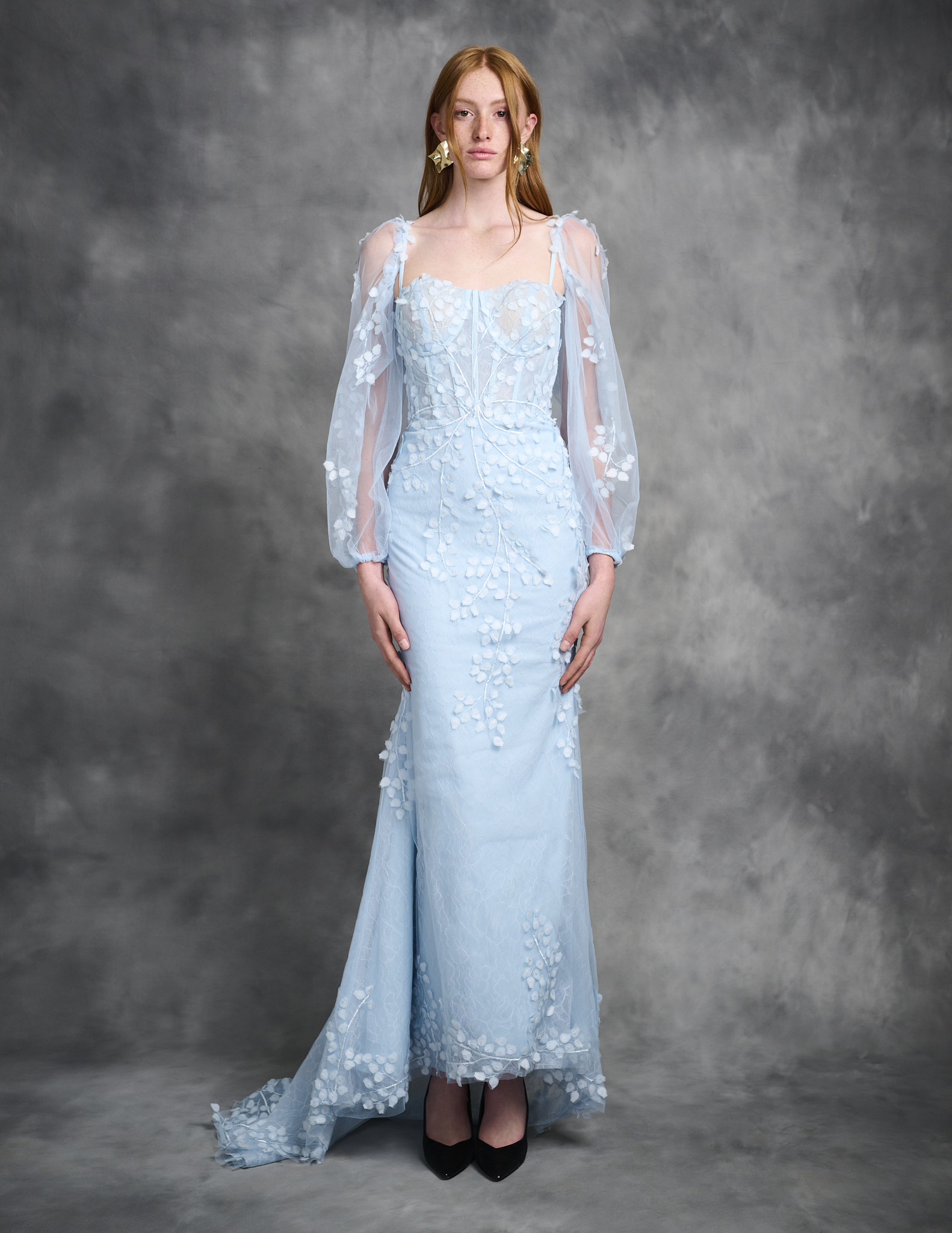Made out of soft tulle and lace, Anastasia is a gorgeous option for fashion forward brides looking blue fitted dresses with modern details as removable tulle sleeves.