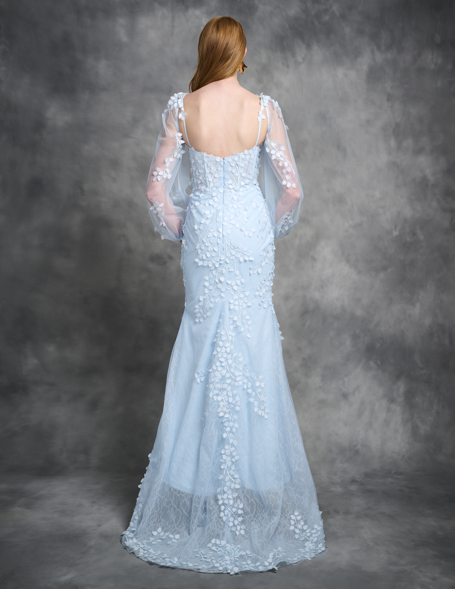 Chantilly lace, Fit & flare light blue wedding dress, made with structured bustier featuring detachable sleeves & spaghetti straps fully removable giving you two looks in one. Top can be lined by request with no extra cost.