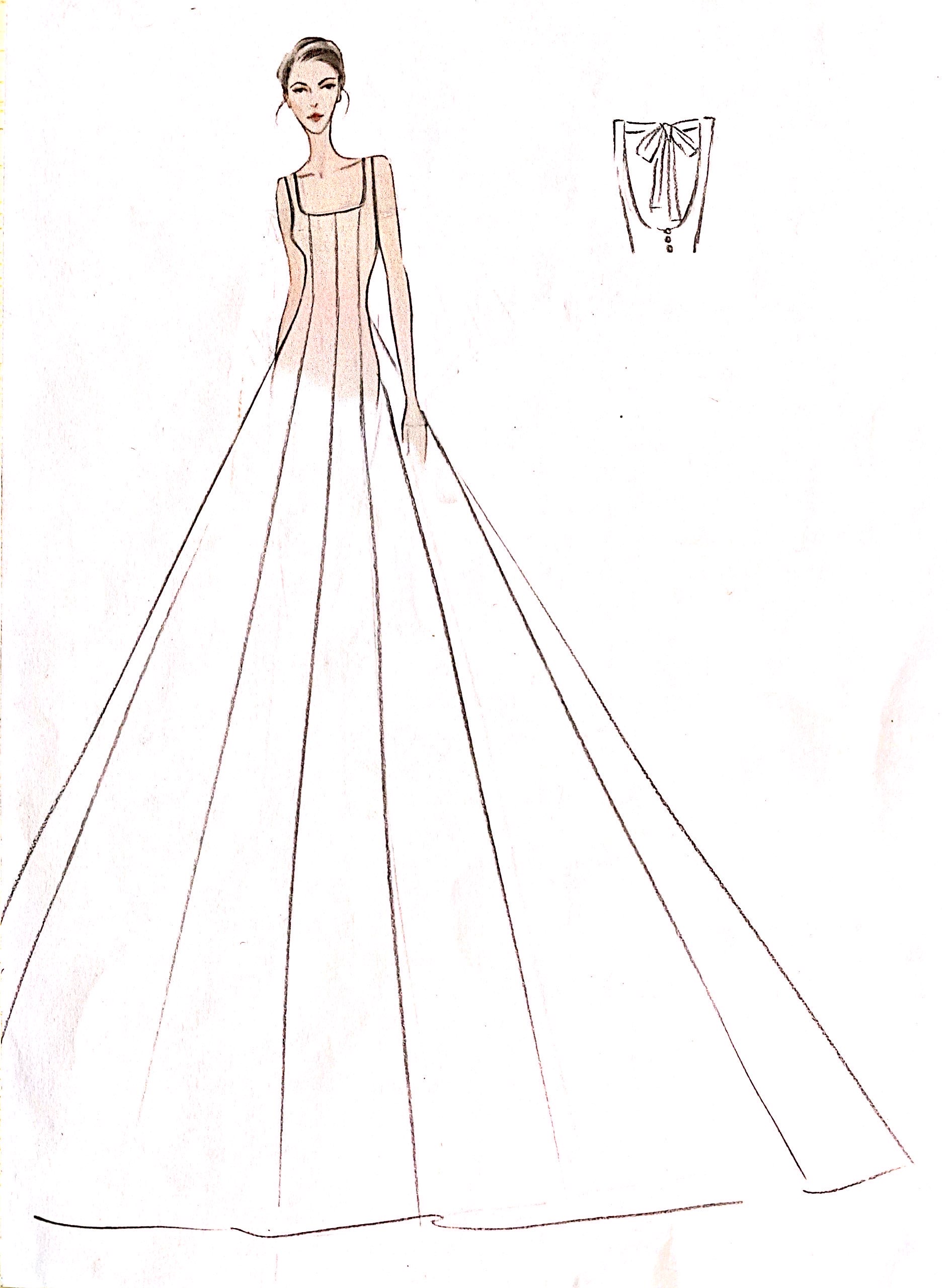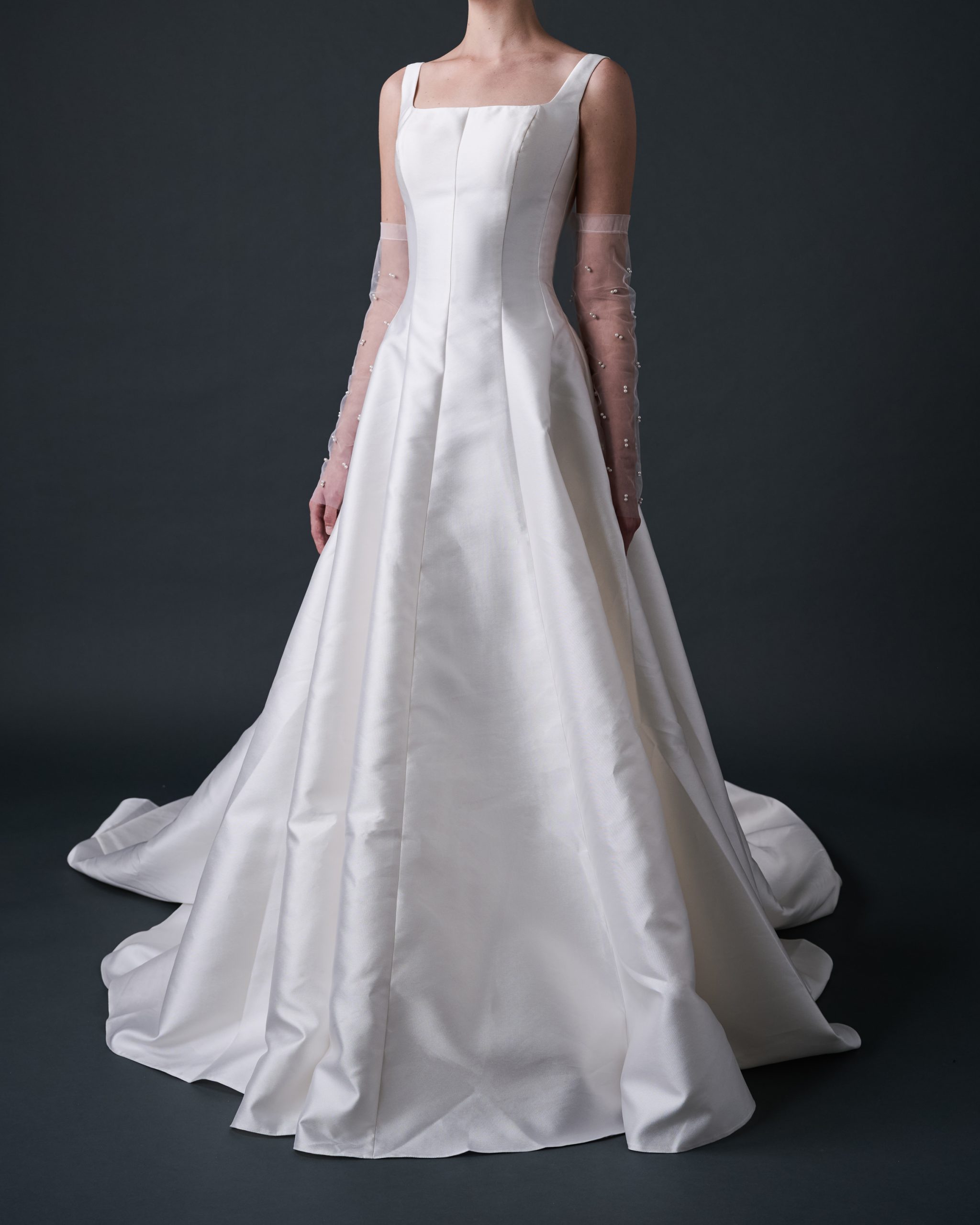 Made out of italian mikado. This style features a classic A line skirt with a squared neckline, soft to the touch, this gown will impress your guest of how elegant it is. The timeless silhouette, fitted at the top flared in the skirt through panels, will give you the perfect fit accentuate the bodice and starts its a line in the high hip. The back detail is an unforgettable detail that tights in different ways, either centered or side,. The train will bring the perfect final touch.
