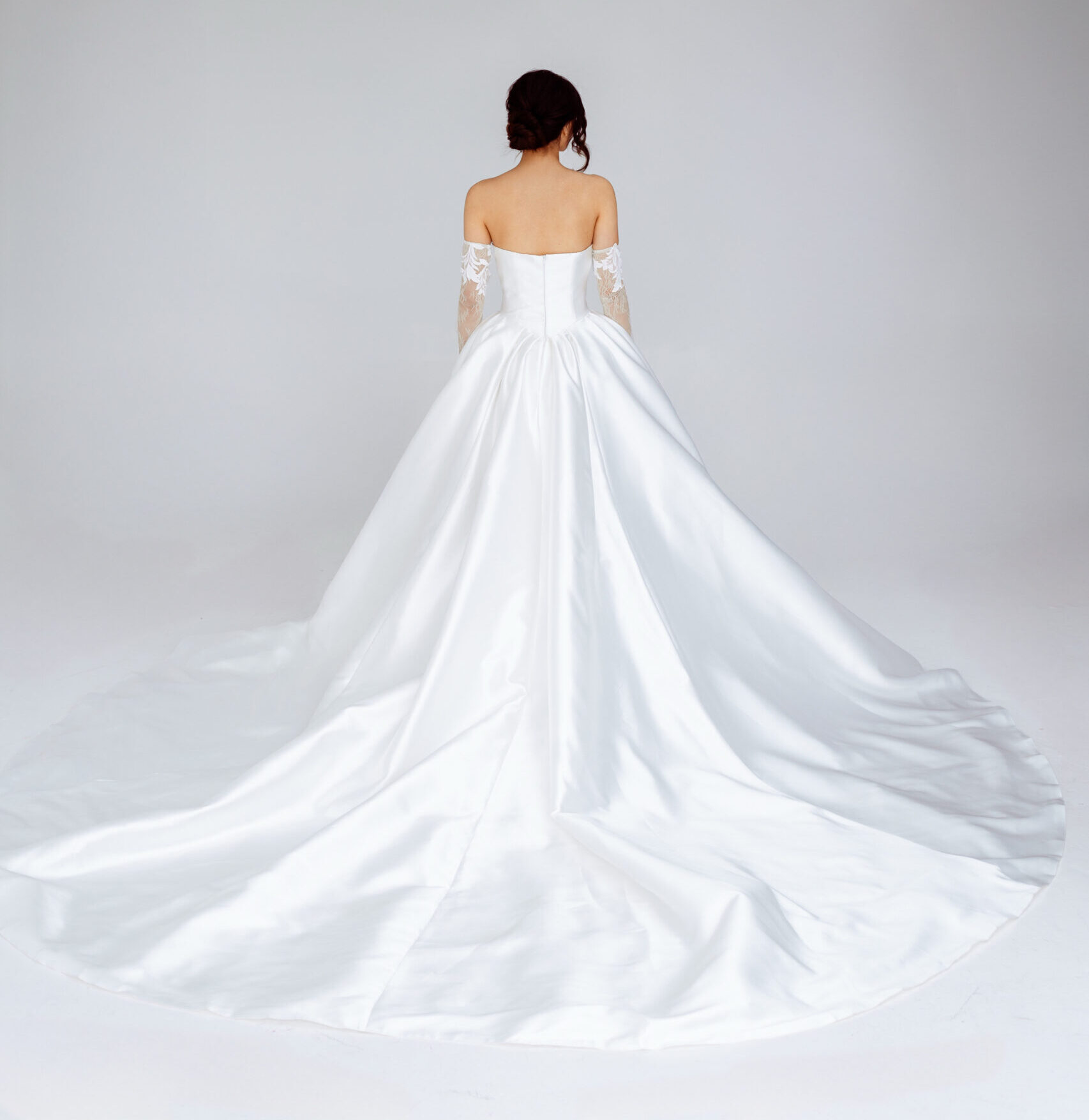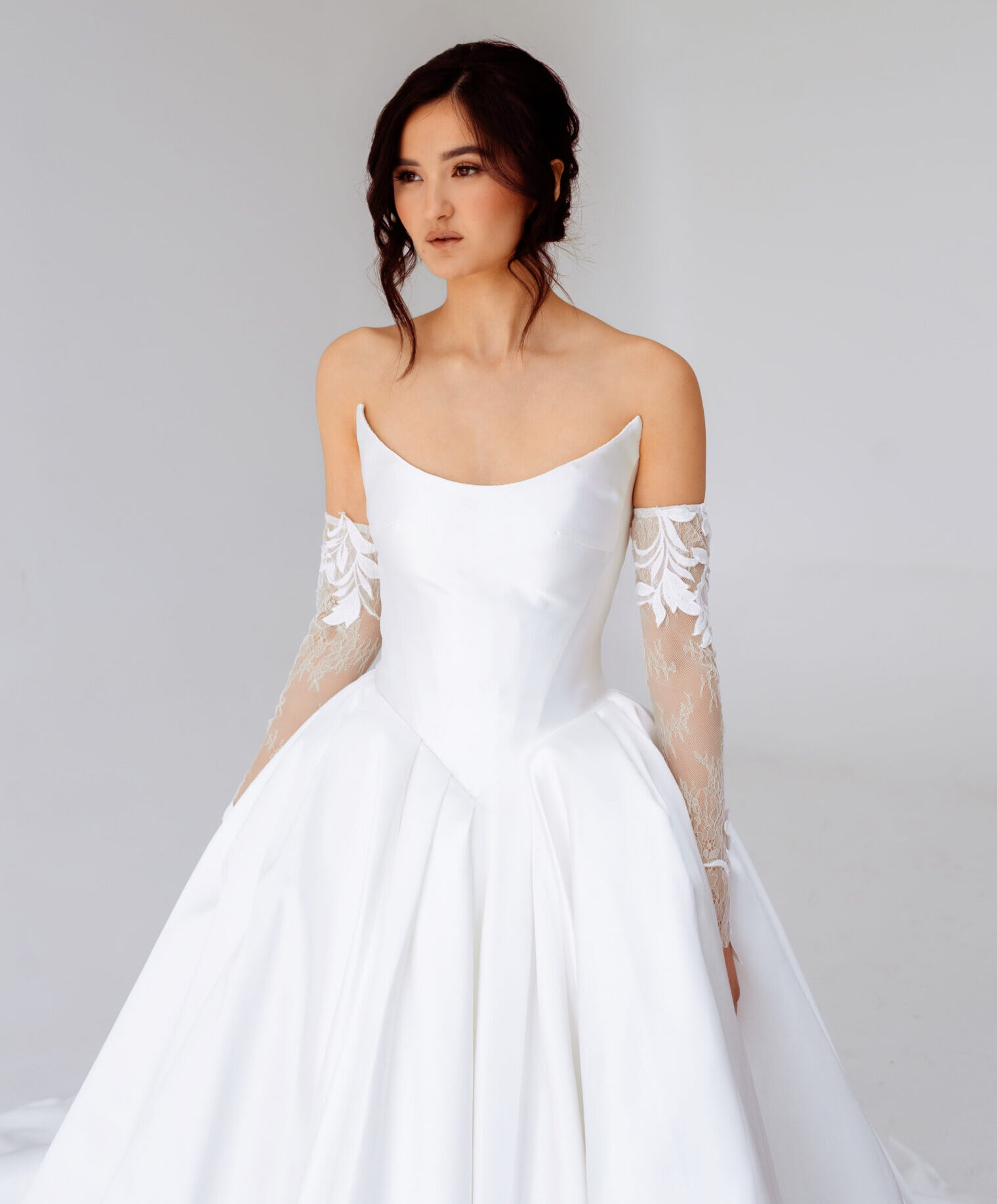 Furthermore, complemented by detachable lace-embroidered sleeves, this gown effortlessly combines romantic charm and contemporary sophistication, making it ideal for the bride who desires both grace and a chic gown with a Basque waist.