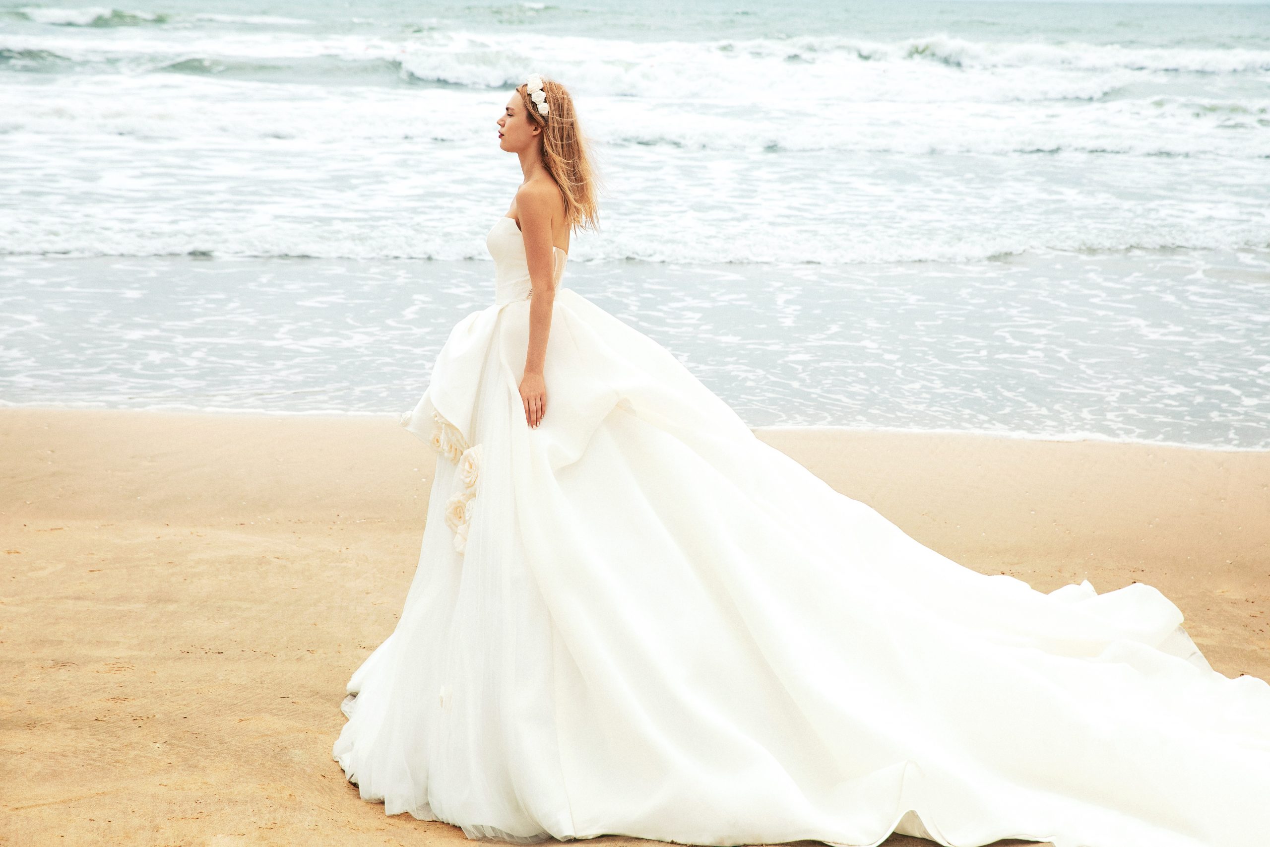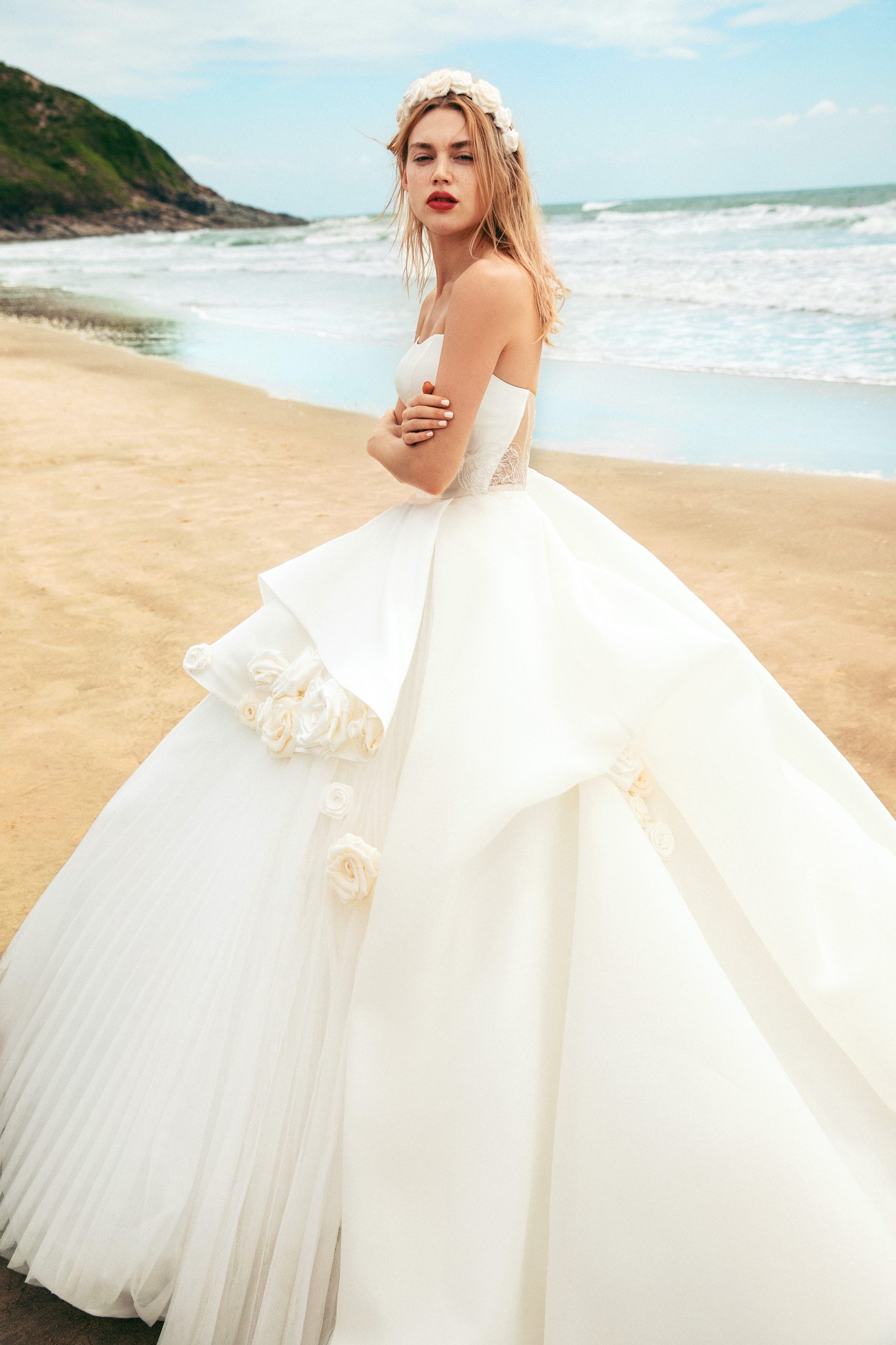 STYLE: CLARA – Organza Layered Mikado Strapless Ball Gown With Floral Appliqués