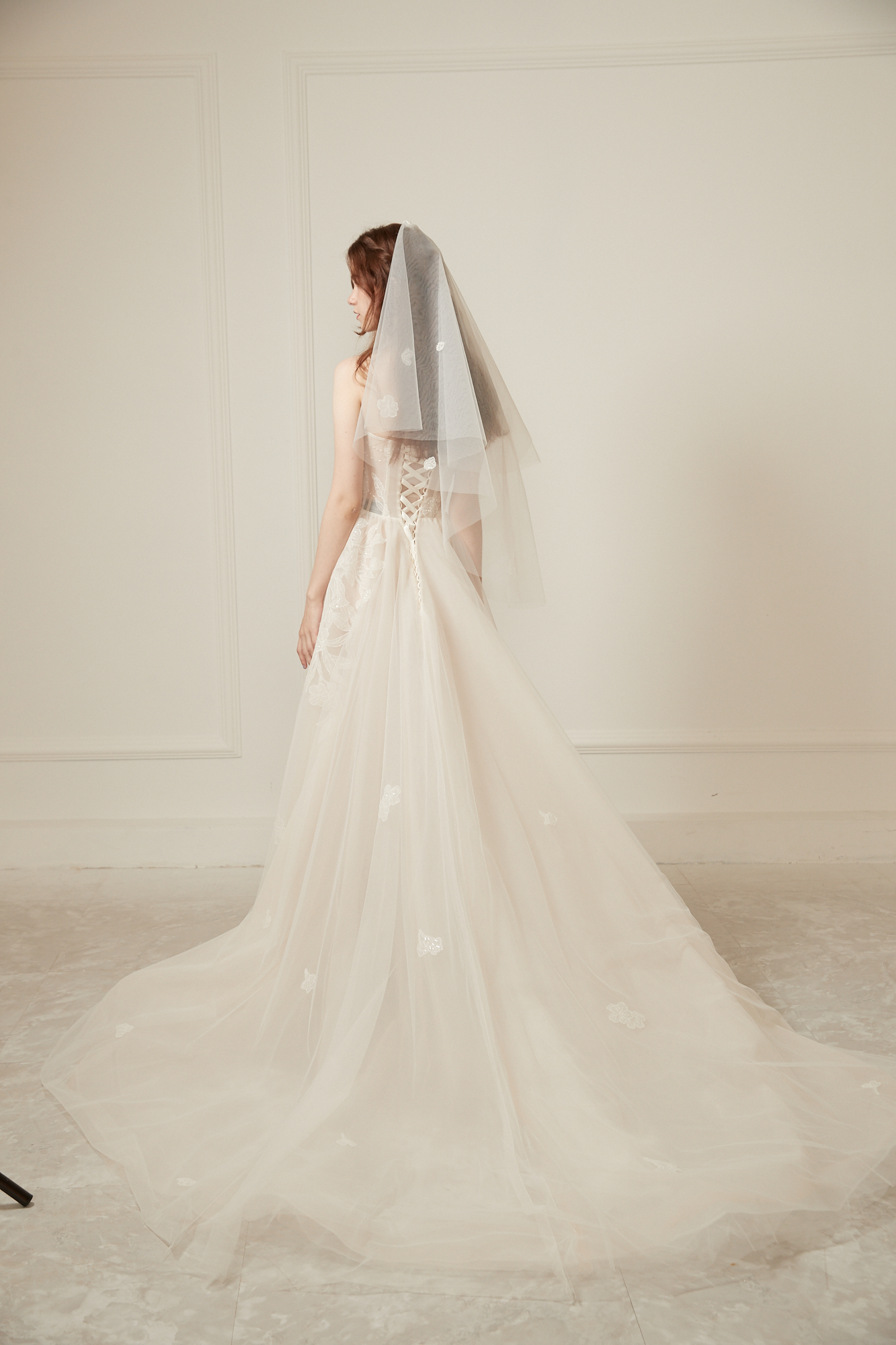 Step into elegance with this stunning strapless A-line wedding dress, crafted for brides who adore romance and timeless sophistication. Designed with a delicate lace-embellished bodice and a flowing champagne-toned tulle skirt, this gown is perfect for a dreamy wedding. From the mountains to a sophisticated venue in the Hamptons, this design will make a beautiful memory.